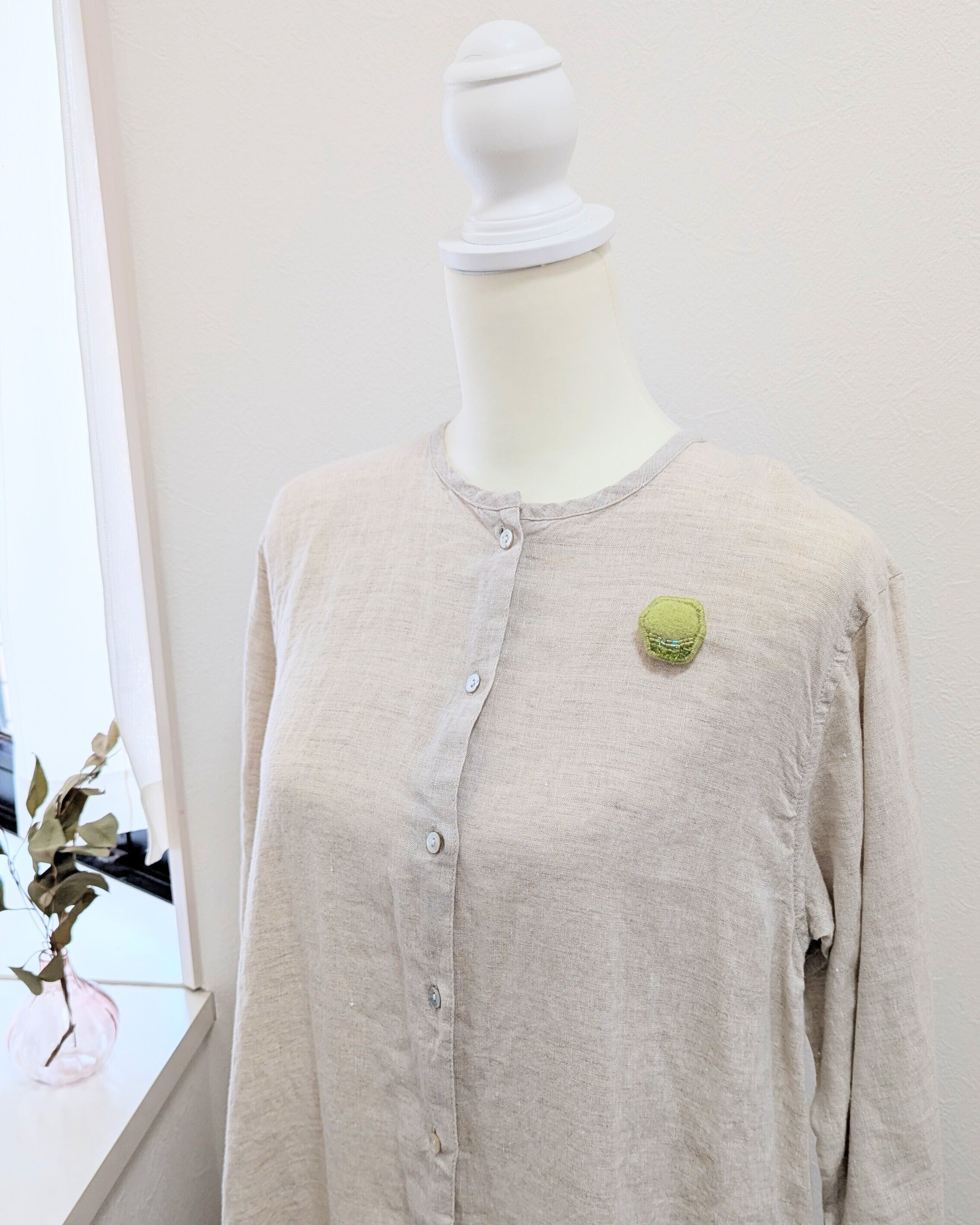 モノトーンやネイビー、アースカラーはもちろん、ブローチと同じ黄緑のワンピースに合わせても馴染みそうです。