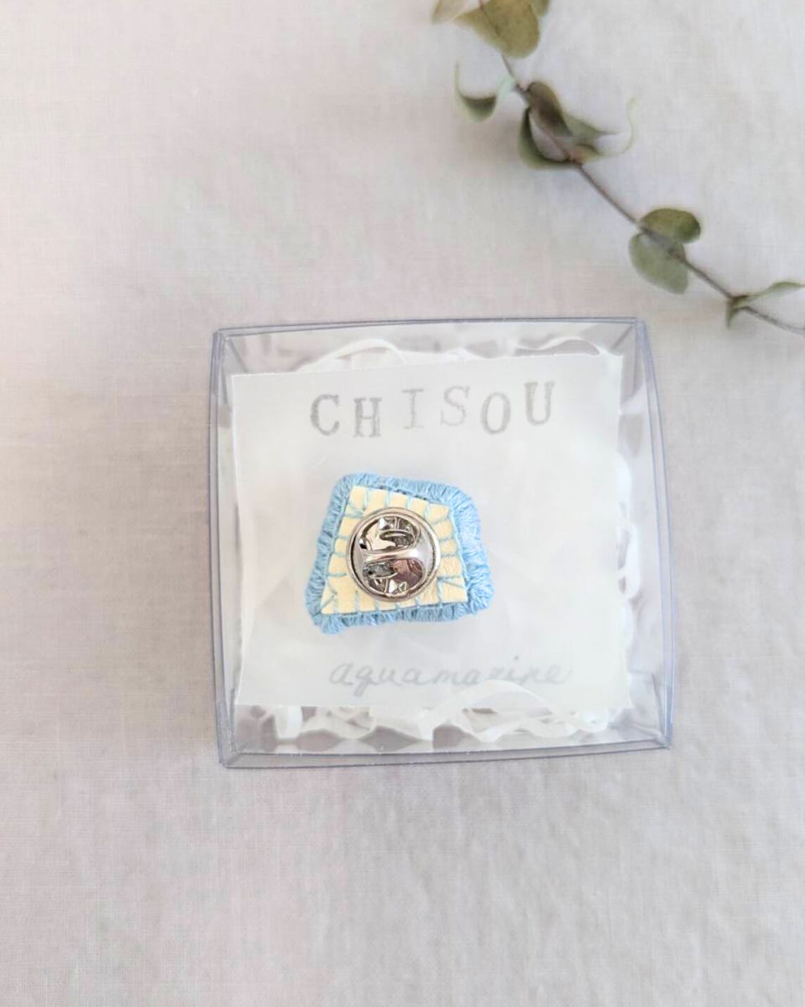 モノトーンやネイビー、アースカラーはもちろん、ブローチと同じ水色の服に合わせても馴染みそうです。