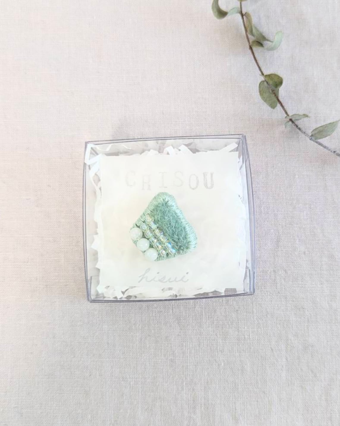羊毛の色は、翡翠に合わせて白と青緑を混ぜて作りました。ビーズは色付き透明タイプで